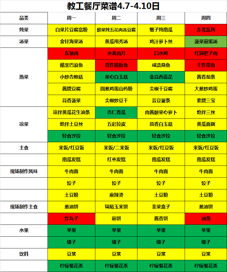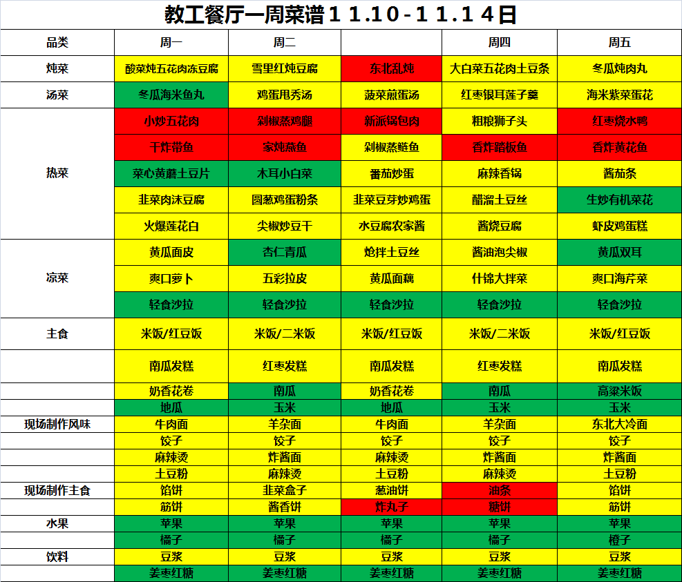 教工餐厅一周菜谱